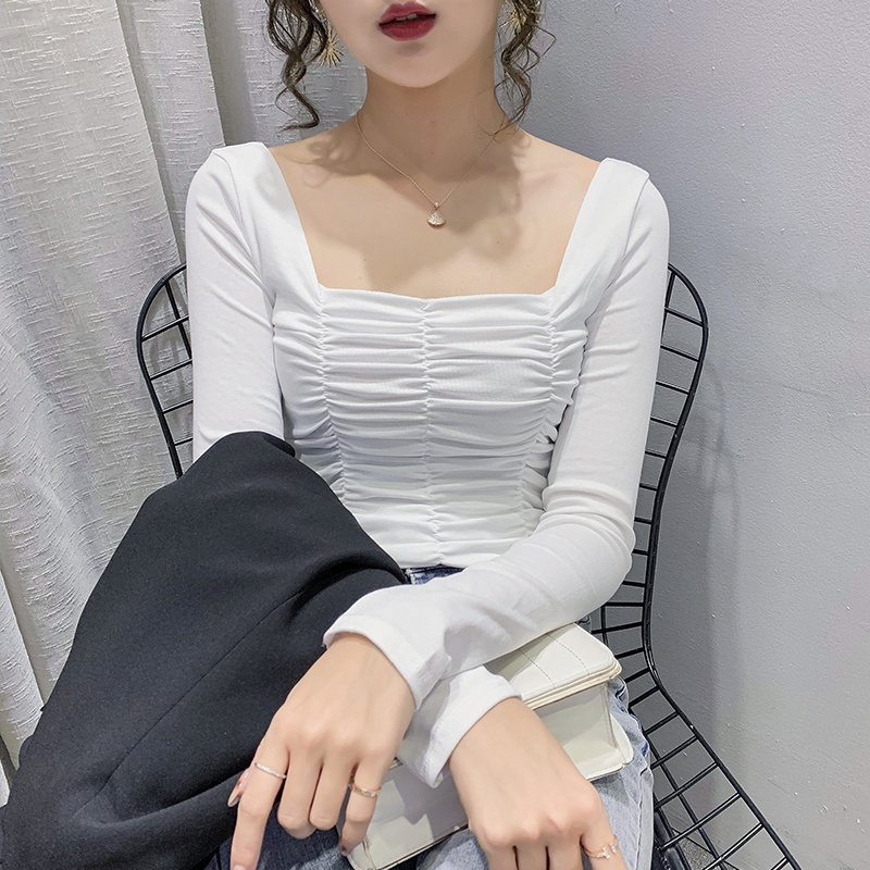 2020新款秋冬长袖打底衫内搭女方领褶皱上衣网红ins超火设计感。热门设计联盟服务商